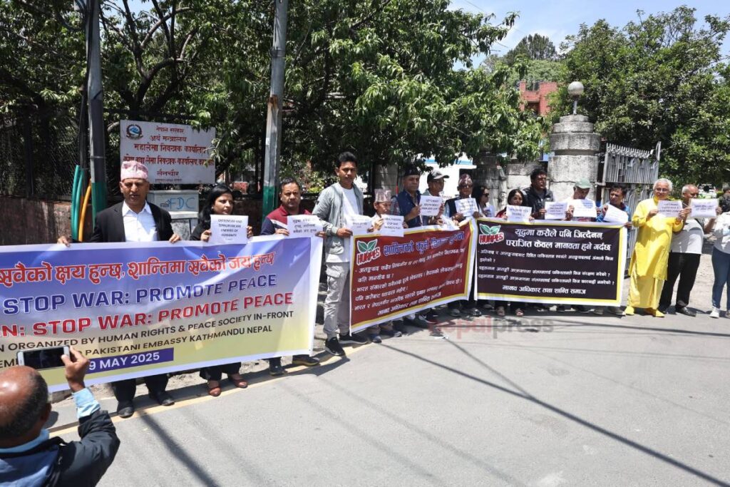 काठमाडौं । मानव अधिकार तथा शान्ति समाजले भारतीय दूतावासमा प्रदर्शन गरेका छन् । कृष्ण पहाडीलगायतका मानव अधिकारकर्मीले लैनचौरस्थित भारतीय दूतावासअघि ‘युद्ध रोक, शान्ति प्रवर्द्धन गर’ भन्दै प्रदर्शन गरेका हुन् ।
