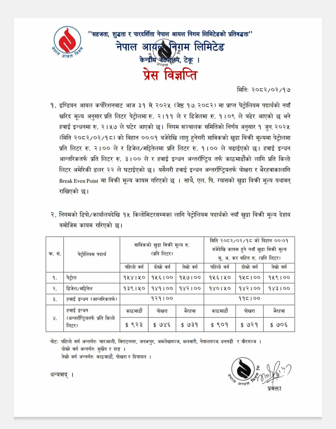 नयाँ मूल्यअनुसार काठमाडौं उपत्यकामा पेट्रोल १५९ र डिजेल तथा मट्टीतेल १४३ रुपैयाँ प्रतिलिटर पुगेको छ ।निगमले हवाई इन्धनको मूल्य भने घटाएको छ । हवाई इन्धन प्रतिलिटर आन्तरिकतर्फ ३ र अन्तर्राष्ट्रियतर्फ काठमाडौंमा २२ अमेरिकी डलरले घटाइएको छ ।