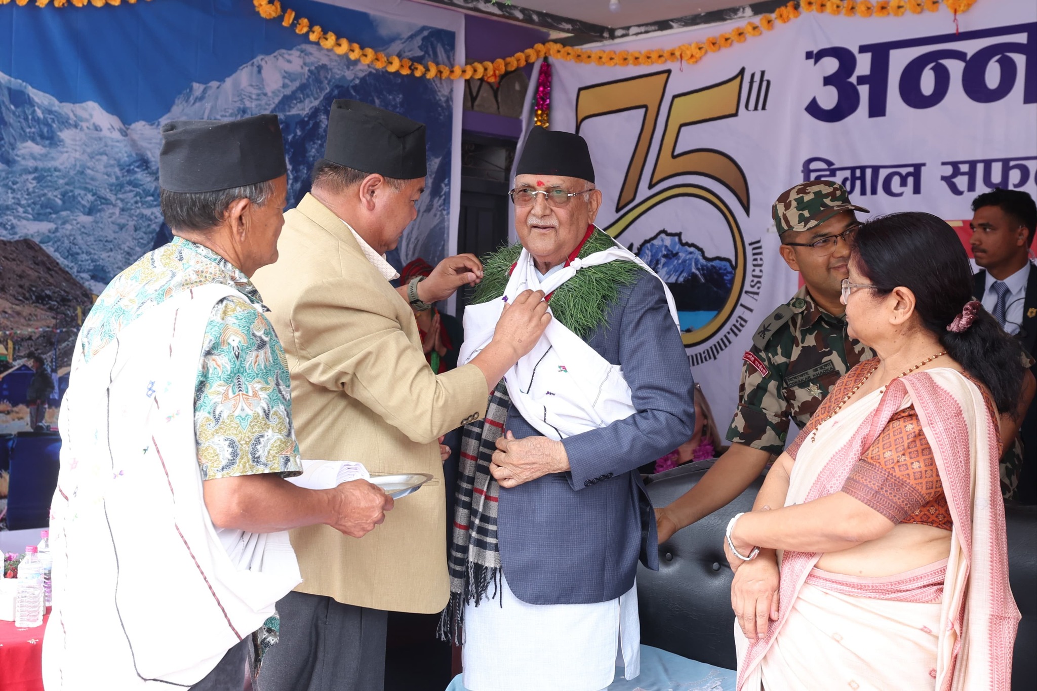 म्याग्दी । प्रधानमन्त्री केपी शर्मा ओलीले हिमाल आरोहणलाई सुरक्षित बनाउन सरकार क्रियाशील रहेको बताएका छन् । अन्नपूूर्ण हिमाल आरोहणको हीरक महोत्सवका अवसरमा आज अन्नपूर्ण गाउँपालिकाले अन्नपूर्ण गाउँपालिका–४ नारच्याङमा आयोजना गरेको समारोहमा प्रधानमन्त्री ओलीले हिमाल आरोहणको जोखिम घटाउन सरकारले काम गरिरहेको बताए ।