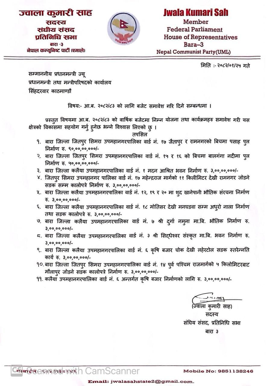 त्यसरी नै अर्को दल एमालेले सांसद ज्वालाकुमारी साहको चुनावी क्षेत्रमा ‘मदन आश्रित’का नाममा भवन निर्माणका लागि ३ करोड बजेट छुट्ट्याएको खुलेको छ । आगामी आर्थिक वर्षको बजेटमार्फत उक्त बजेट छुट्ट्याएपछि सामाजिक सञ्जालमा आलोचना भइरहेको छ । उक्त बजेट सहरी विकास मन्त्रालय अन्तर्गत छुट्ट्याइएको हो । नेताका नामबाट बन्ने भवनका लागि आफूले बजेट माग गरेको सांसद साहले स्वीकार गरिन् । उनले सामाजिक सञ्जालमा भइरहेको आलोचनाबारे आफूलाई कुनै प्रतिक्रिया दिन जरुरी नभएको बताइन् ।