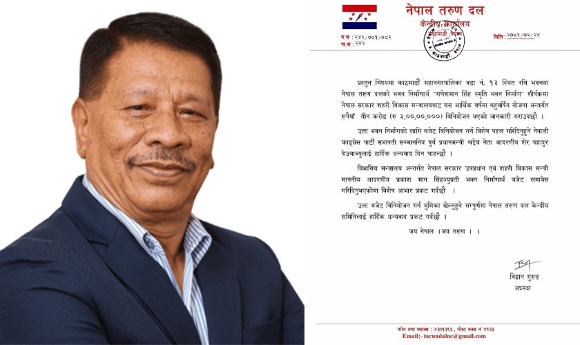 उक्त रकम उपप्रधान एवं सहरी विकास मन्त्री प्रकाशमान सिंहको मन्त्रालयमार्फत विनियोजन गरिएको हो । प्रकाशमान गणेशमानका छोरा हुन् । भवन निर्माणार्थ सहरी विकास मन्त्रालयबाट आर्थिक वर्षमा बहुवर्षीय योजना अन्तर्गत तीन करोड विनियोजन भएको तरुण दलका अध्यक्ष विद्वान गुरुङले सार्वजनिक गरेका हुन् । भवन निर्माणका लागि बजेट विनियोजनको पहल गरेकोमा गुरुङले सभापति शेरबहादुर देउवा र मन्त्री सिंहलाई धन्यवाद दिँदै फेसबुकमा पत्रसहित सार्वजनिक गरेका थिए ।