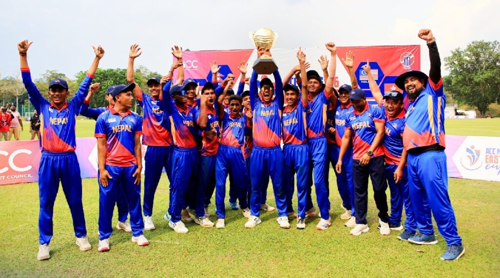 काठमाडौं। नेपालले एसिसी पुरुष यु–१६ इस्ट जोन कपको उपाधि रक्षा गरेको छ। शनिबार सम्पन्न खेलमा नेपालले सिंगापुरलाई २ विकेटले पराजित गरेको हो। नेपालले सन् २०२३ मा पनि यो कपको उपाधि उचालेको थियो। सिंगापुरले प्रस्तुत गरेको ११४ रनको लक्ष्य पछ्याएको नेपालले २९ ओभरमा ८ विकेट गुमाउँदै ११७ रन बनाएको हो। योसँगै संगापुर समूह चरणको हारको बदला लिन फेरि चुकेको छ।