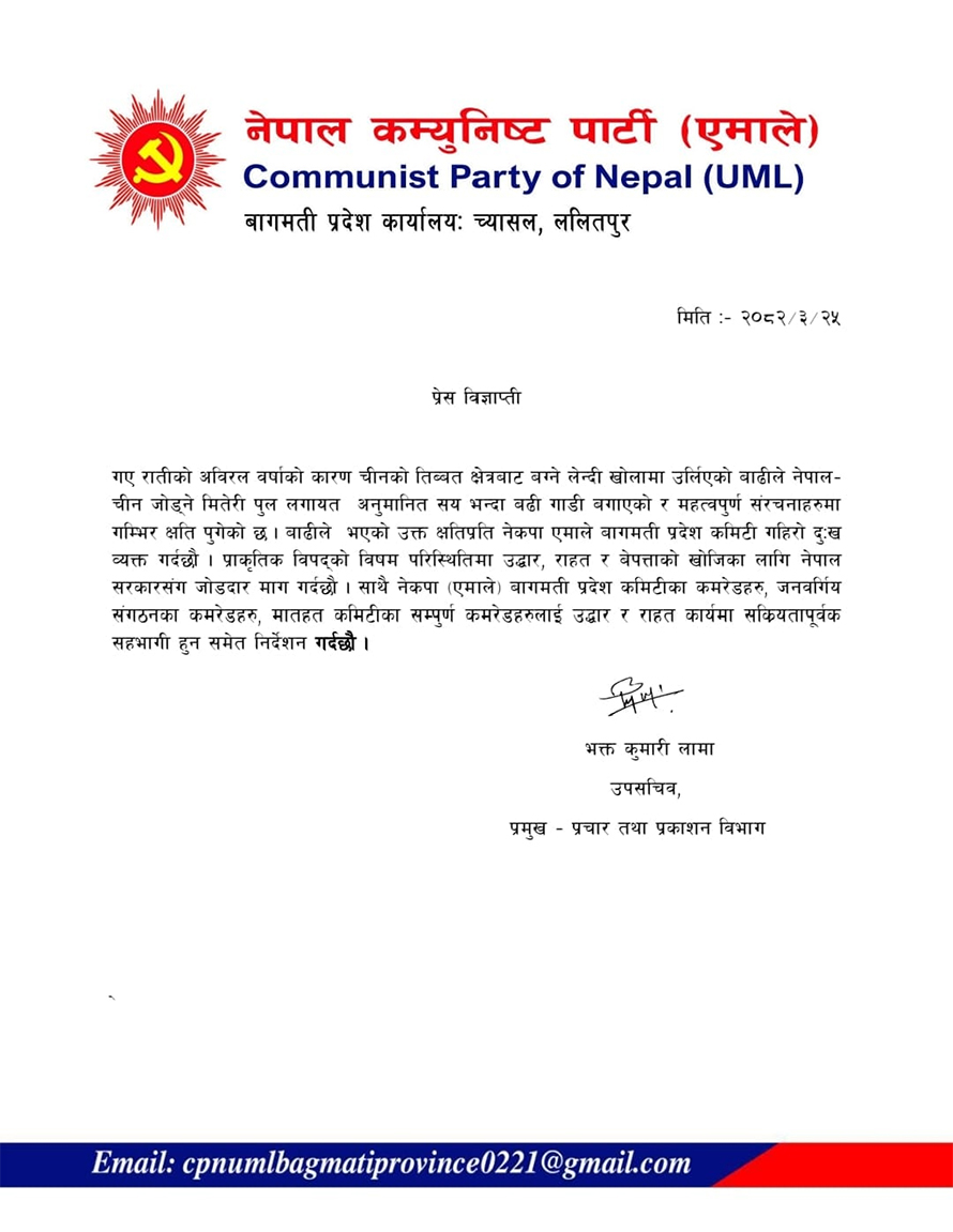 ‘प्राकृतिक विपद्को विषम परिस्थितिमा उद्दार, राहत र बेपत्ताको खोजीका लागि नेपाल सरकारसँग जोडदार माग गर्दछ ।’ पार्टीका उपमहासचिव भक्त कुमारी लामाद्वारा जारी विज्ञप्तिमा भनिएको छ । यस्तै एमाले बागमती प्रदेश कमिटी, जनवर्गीय संगठन, मातहत कमिटीका सम्पूर्ण कार्यकर्ताहरूलाई बाढी उद्दार र रात कार्यमा सक्रिय सहभागी हुन पार्टीले निर्देशन दिएको छ ।