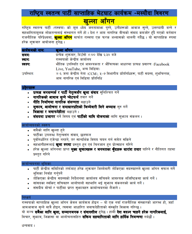 काठमाडौँ । राष्ट्रिय स्वतन्त्र पार्टी ९रास्वपा० ले प्रत्यक्ष जनसम्पर्क तथा पार्टी नेतृत्व र नागरिकबिच खुला संवादको संस्कार विकास गर्ने उद्देश्यका साथ खुला आँगन कार्यक्रम प्रारम्भ गर्ने भएको छ । यस कार्यक्रममा पार्टी सदस्य, शुभेच्छुक, आम नागरिक सहभागी भई राष्ट्र निर्माणसँग सम्बन्धित विभिन्न विषयहरूमा छलफल, संवाद हुने महामन्त्री कवीन्द्र बुर्लाकोटीले जानकारी दिएका छन् ।