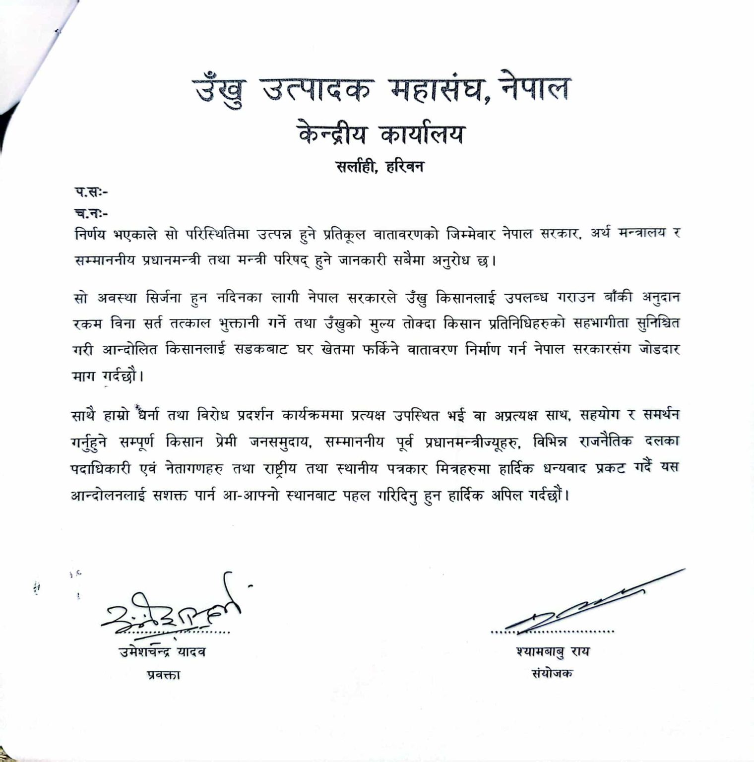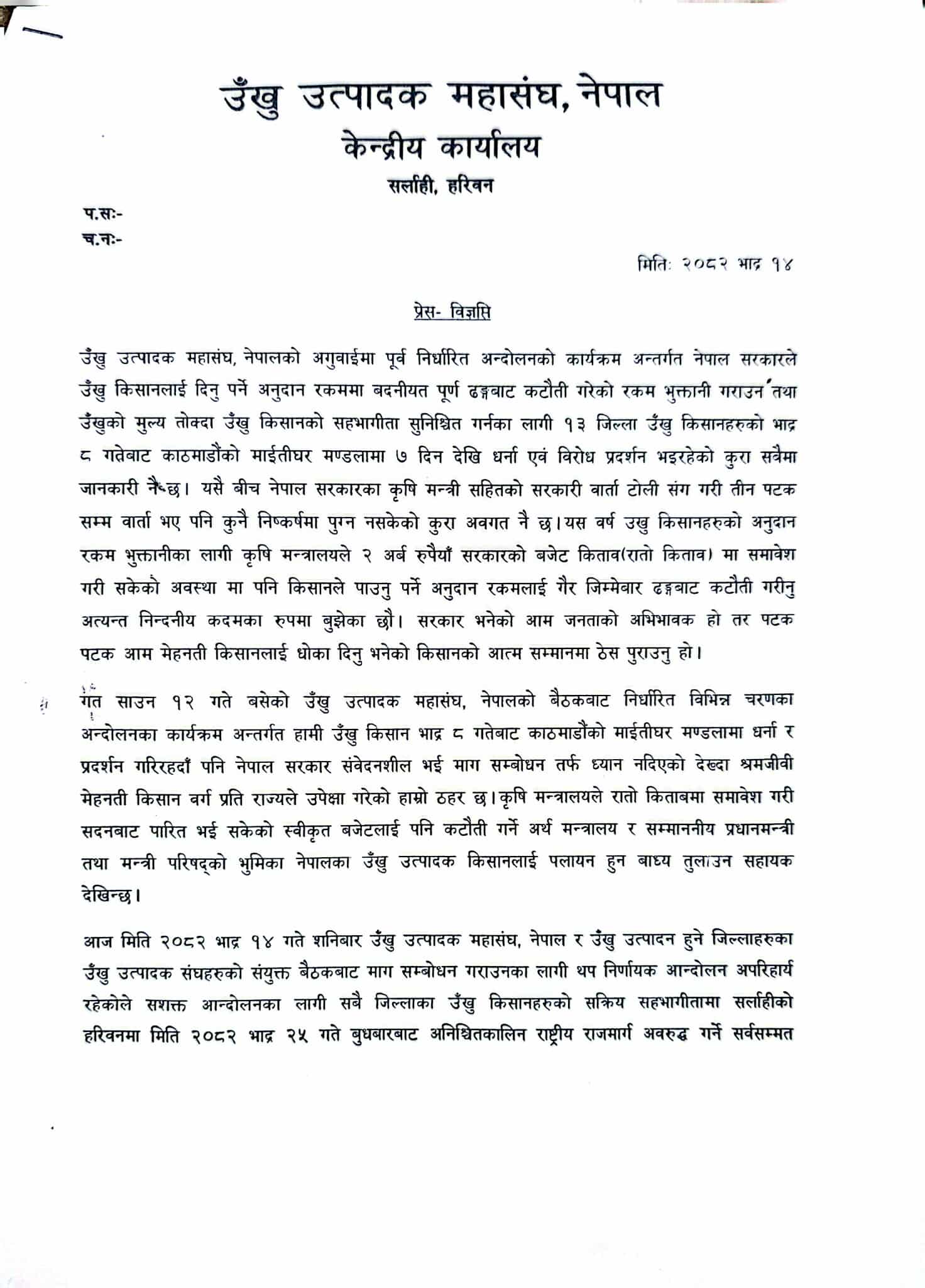 उखु उत्पादक महासंघ, नेपाल र उखु उत्पादन हुने जिल्लाहरुका संघको शनिबार बसेको संयुक्त बैठकले यही भदौ २५ गतेदेखि राजमार्ग अवरुद्धा पारेर आन्दोलन गर्न निर्णय गरेको हो ।