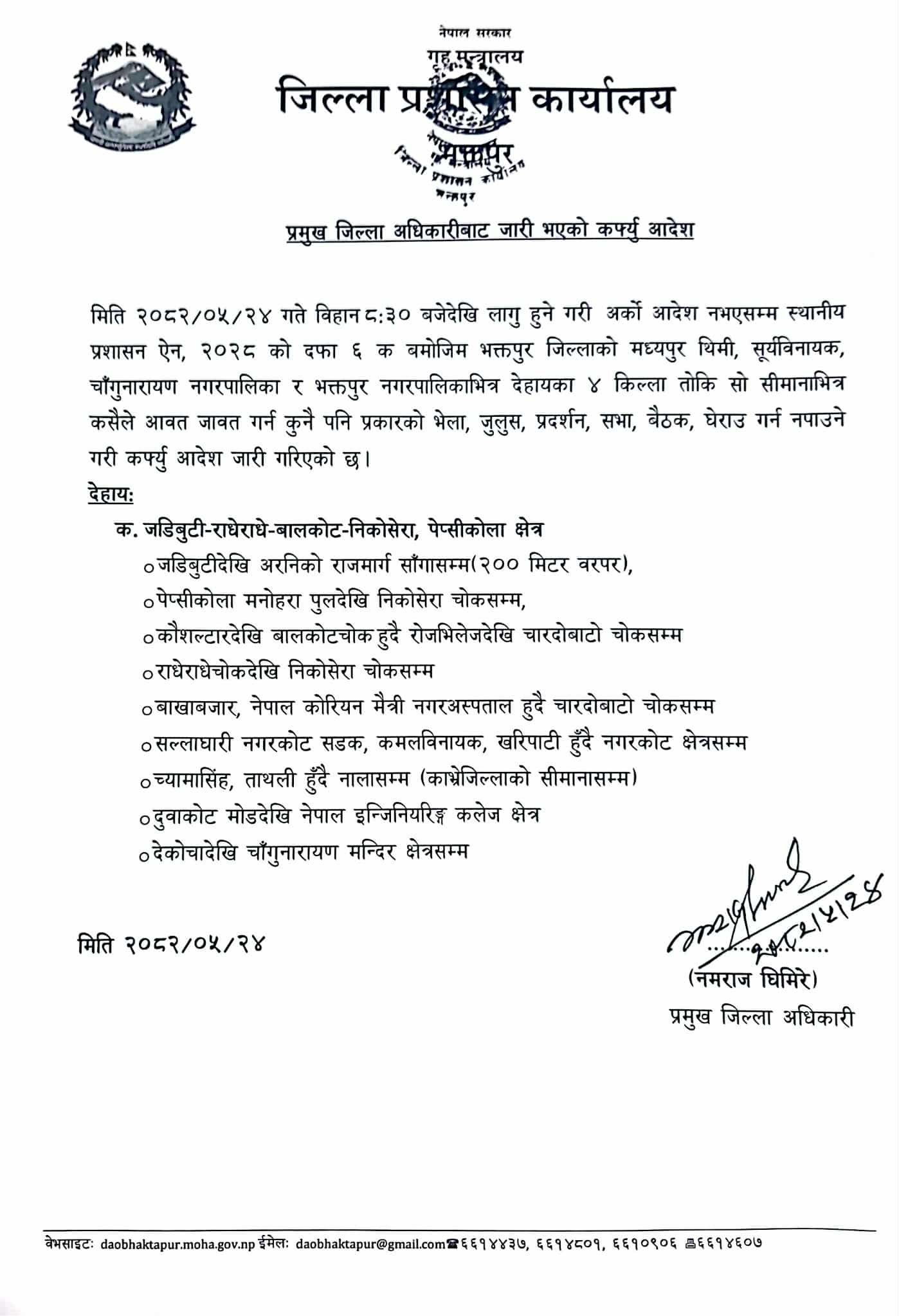 जिल्ला प्रशासन कार्यालय भक्तपुर एक सूचना जारी गर्दै जिल्लाको मध्यपुर थिमी, सूर्यविनायक, चाँगुनारायण नगरपालिका र भक्तपुर नगरपालिकाभित्र आवत जावत गर्न कुनै पनि प्रकारको भेला, जुलुस, प्रदर्शन, सभा, बैठक, घेराउ गर्न नपाउने गरी कफ्यु आदेश जारी गरिएको जनाएको हो ।
