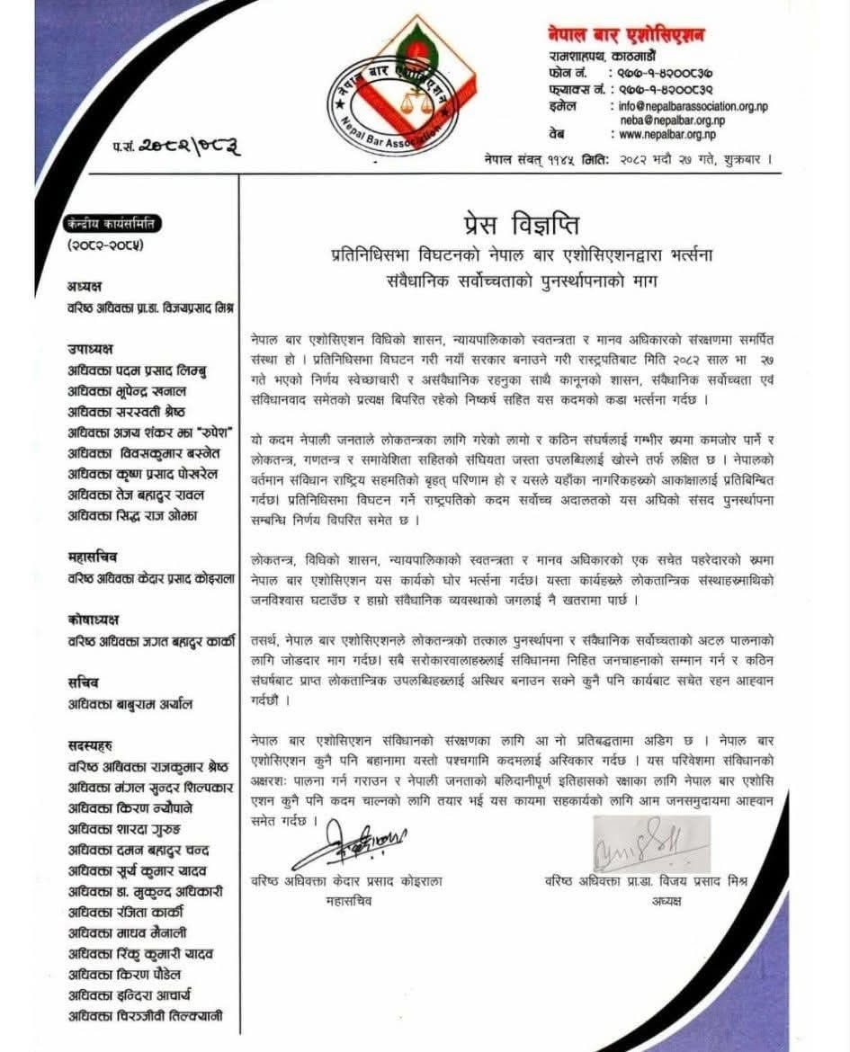बारले प्रतिनिधिसभा विघटन गर्ने राष्ट्रपतिको कदम सर्वोच्च अदालतको यस अघिको संसद पुनर्स्थापना सम्बन्धि निर्णय विपरित समेत रहेको बताएको छ। ‘लोकतन्त्र, विधिको शासन, न्यायपालिकाको स्वतन्त्रता र मानव अधिकारको एक सचेत पहरेदारको रूपमा नेपाल बार एशोसिएशन यस कार्यको घोर भर्त्सना गर्दछ। यस्ता कार्यहरूले लोकतान्त्रिक संस्थाहरुमाथिको जनविश्वास घटाउँछ र हाम्रो संवैधानिक व्यवस्थाको जगलाई नै खतरामा पार्छ,’ बारले भनेको छ।
