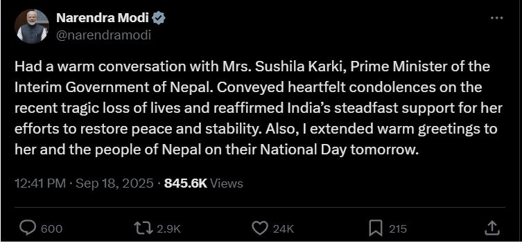 यस्तै, भारतीय प्रधानमन्त्री मोदीले नेपालकी प्रधानमन्त्री कार्कीलाई उनको नियुक्तिमा बधाई दिंदै भारत सरकार र भारतीय जनताको तर्फबाट शुभकामना व्यक्त गरेका छन् । मोदीले नेपालमा हालै भएका विरोध प्रदर्शनका क्रममा भएको दुःखद निधनप्रति हार्दिक समवेदना व्यक्त गरेको पनि नेपालस्थित् भारतीय दूतावासले जनाएको छ ।
