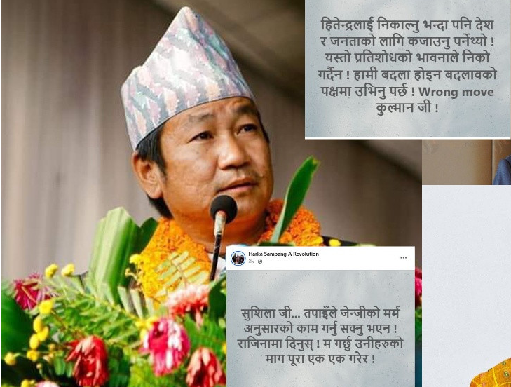 त्यस्तै, ऊर्जा मन्त्रीले नेपाल विद्युत् प्राधिकरणका तत्कालीन निर्देशक हितेन्द्र शाक्यलाई हटाएको कुराको पनि उनले विरोध गरेका छन्। उनले लेखेका छन्, ‘हितेन्द्रलाई निकाल्नुभन्दा पनि देश र जनताको लागि कजाउनुपर्ने थियो। यस्तो प्रतिशोधको भावनाले निको गर्दैन। हामी बदला होइन बदलावको पक्षमा उभिनुपर्छ। गलत चाल कुलमान जी।’ नयाँ पुस्ताका युवाहरुको आन्दोलनपछि बनेको सरकारमा प्रधानमन्त्रीसहित केही मन्त्रीहरू ७० वर्षका आसपासका नियुक्त भएपछि आलोचना हुन थालेको छ ।