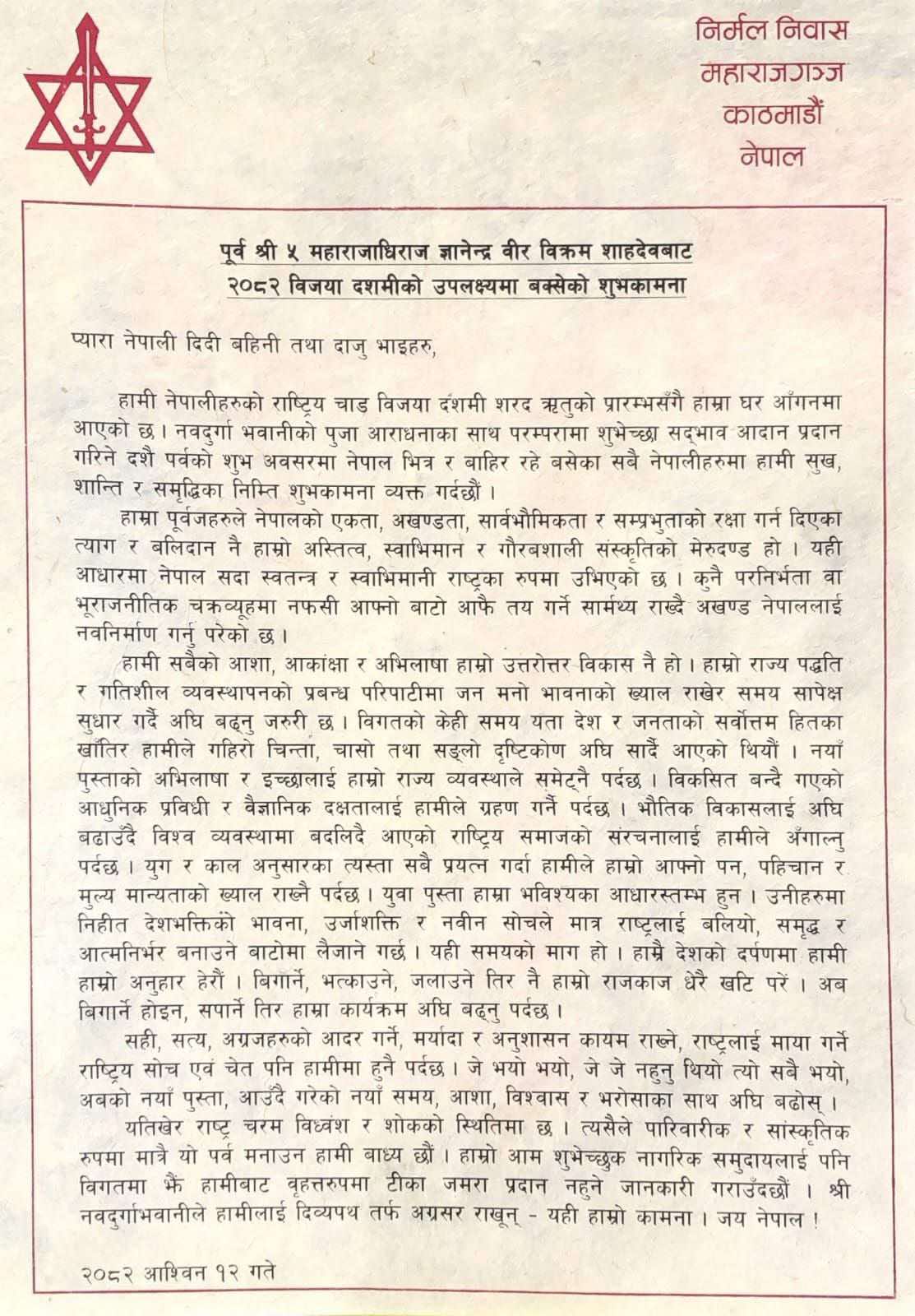 ‘यही आधारमा नेपाल सदा स्वतन्त्र र स्वाभिमानी राष्ट्रका रुपमा उभिएको छ,’ शुभकामना सन्देशमा भनिएको छ, ‘कुनै परनिर्भता वा भूराजनीतिक चक्रव्यूहमा नफसी आफ्नो बाटो आफैँ तय गर्ने सामर्थ्य राख्दै अखण्ड नेपाललाई नवनिर्माण गर्नु परेको छ।’ उनले नवदुर्गा भवानीको पूजा आराधनाका साथ परम्परामा शुभेच्छा, सद्भाव आदान–प्रदान गरिने दसैँ पर्वको शुभ अवसरमा नेपालभित्र र बाहिर रहे–बसेका सबै नेपालीमा सुख, शान्ति र समृद्धिका निम्ति शुभकामना व्यक्त गरेका छन्। राष्ट्र चरम विध्वंश र शोकमा रहेको उल्लेख गर्दै विगतमा जस्तो टीका–जमरा प्रदान नहुने समेत स्पष्ट पारेका छन् ।