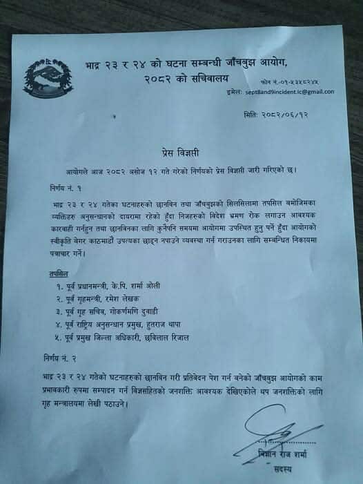 काठमाडौं । जेनजी आन्दोलनको घटना छानबिनका लागि गठित जाँचबुझ आयोगले पूर्वप्रधनमन्त्री केपी शर्मा ओलीसहित ५ जनाको विदेश भ्रमणमा रोक लगाउन सम्बन्धित निकायमा सिफारिस गर्ने निर्णय गरकेो छ । आयोगले ओलीसहित पूर्वगृहमन्त्री रमेश लेखक, तत्कालीन गृहसचिव गोकर्णमणि दुवाडी, राष्ट्रिय अनुसन्धान विभागका तत्कालीन प्रमुख हुतराज थापा र काठमाडौंका तत्कालीन सीडीओ छविलाल रिजालको हकमा उक्त निर्णय गरेको हो ।