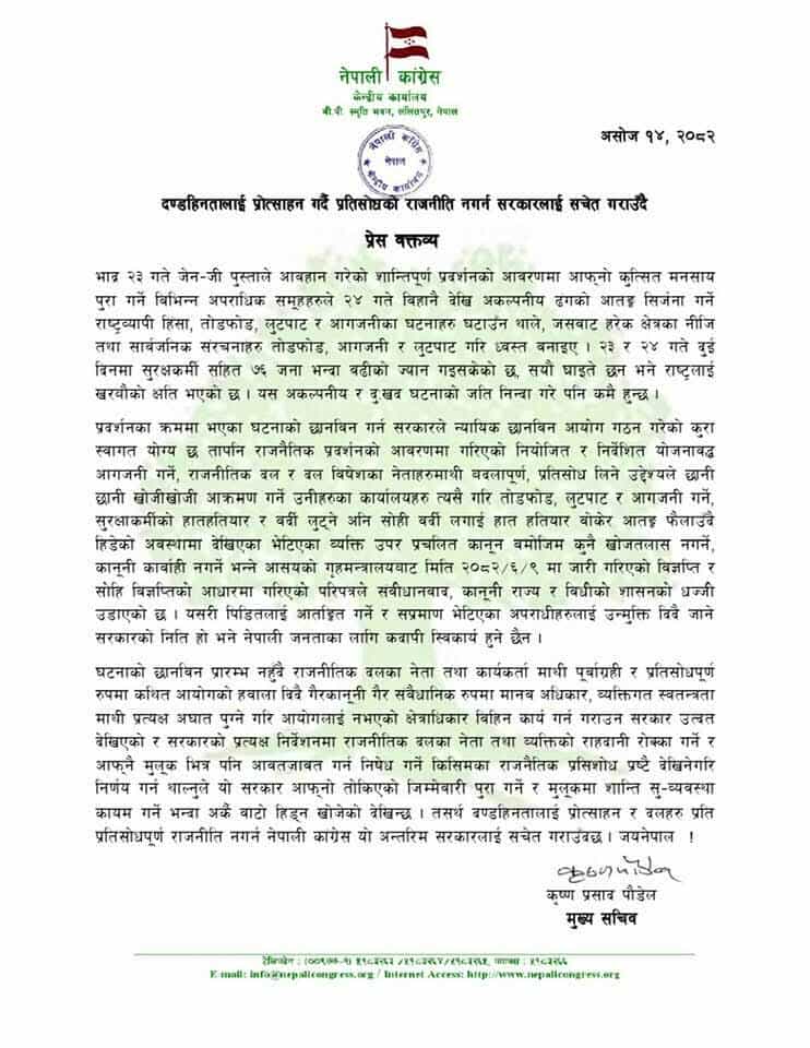 मुख्यसचिव कृष्ण पौडेलले जारी गरेको विज्ञप्तिमा घटनाको छानबिन प्रारम्भ नहुँदै पूर्वाग्रही ढंगले नेता र व्यक्तिहरूको राहदानी रोक्का गर्ने र आफ्नै देशमा पनि आवतजावत गर्न निषेध गर्ने कार्य प्रतिशोधपूर्ण रहेको बताइएको छ ।
