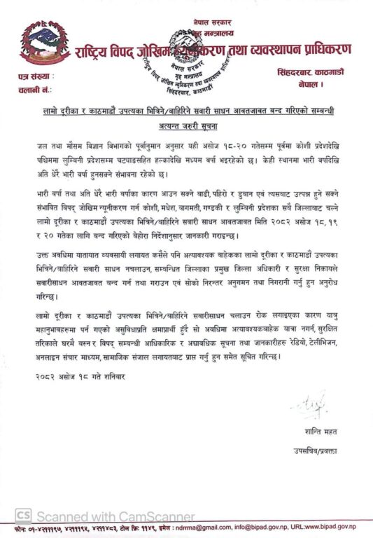 ‘भारी वर्षा तथा अति धेरै भारी वर्षाका कारण आउन सक्ने बाढी, पहिरो र डुबान एवं त्यसबाट उत्पन्न हुने सक्ने संभावित विपद् जोखिम न्यूनीकरण गर्न कोशी, मधेश, बागमती, गण्डकी र लुम्बिनी प्रदेशका सबै जिल्लाबाट चल्ने लामो दूरीका र काठमाडौं उपत्यका भित्रिनेरबाहिरिने सवारी साधन आवतजावत मिति २०८२ असोज १८, १९ र २० गतेका लागि बन्द गरिएको बेहोरा निर्देशानुसार जानकारी गराइन्छ,’ प्राधिकरणको विज्ञप्तिमा उल्लेख छ।