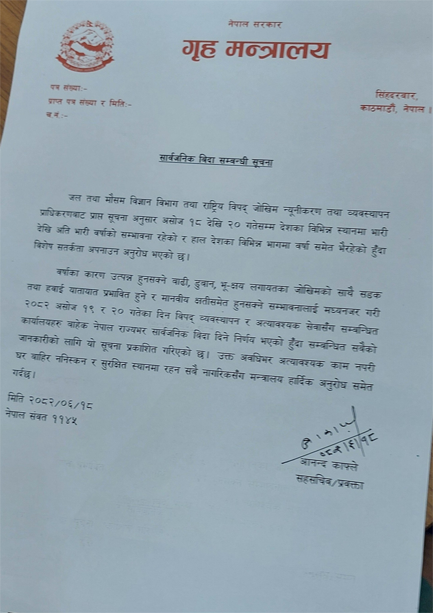 तर, राजमार्गहरूमा खसेको पहिरो र मौसम पूर्वानुमान महाशाखाले जारी गरेको अलर्टलाई ध्यानमा राख्दै बिदा दिने निर्णय भएको हो । त्यस्तै, गृह मन्त्रालयमा देशभरका सीडीओहरूसँग सुरक्षाबारे छलफल भएको छ ।