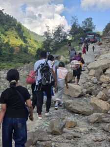 काभ्रेपलाञ्चोक । असोजको अविरल वर्षाका कारण गत १८ र १९ रोशी खोलाको बाढीले बीपी राजमार्ग क्षतिग्रस्त बनायो । केही स्थानमा पैदल समेत हिँड्न नसकिने गरी सडक बगायो । सडक बगेपछि दशैं मनाउन घर पुगेका यात्रुहरू गाडी चढेर यात्रा गर्ने कुरै भएन । तर, पैदल हिँडेर गन्तव्य स्थल पुग्न चाहनेका लागि समेत गोरेटो बाँकी रहेन । एक ठाउँबाट अर्को ठाउँमा पुग्न समेत भीरपाखा, खोला, खोल्सी खोस्रेर जोखिम मोलेर हिँड्नुपर्ने बाध्यता आइपरेको छ ।
