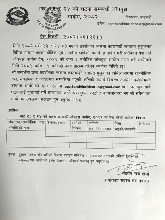 काठमाडौं । भदौ २३ र भदौ २४ को घट्नासम्बन्धी जाँचबुझ आयोगले जेनजी आन्दोलनमा भएको क्षति विवरण बुझाउनको लागि राजनीतिक दल, संघसंस्था र व्यक्तिहरुलाई आह्वान गरेको छ ।