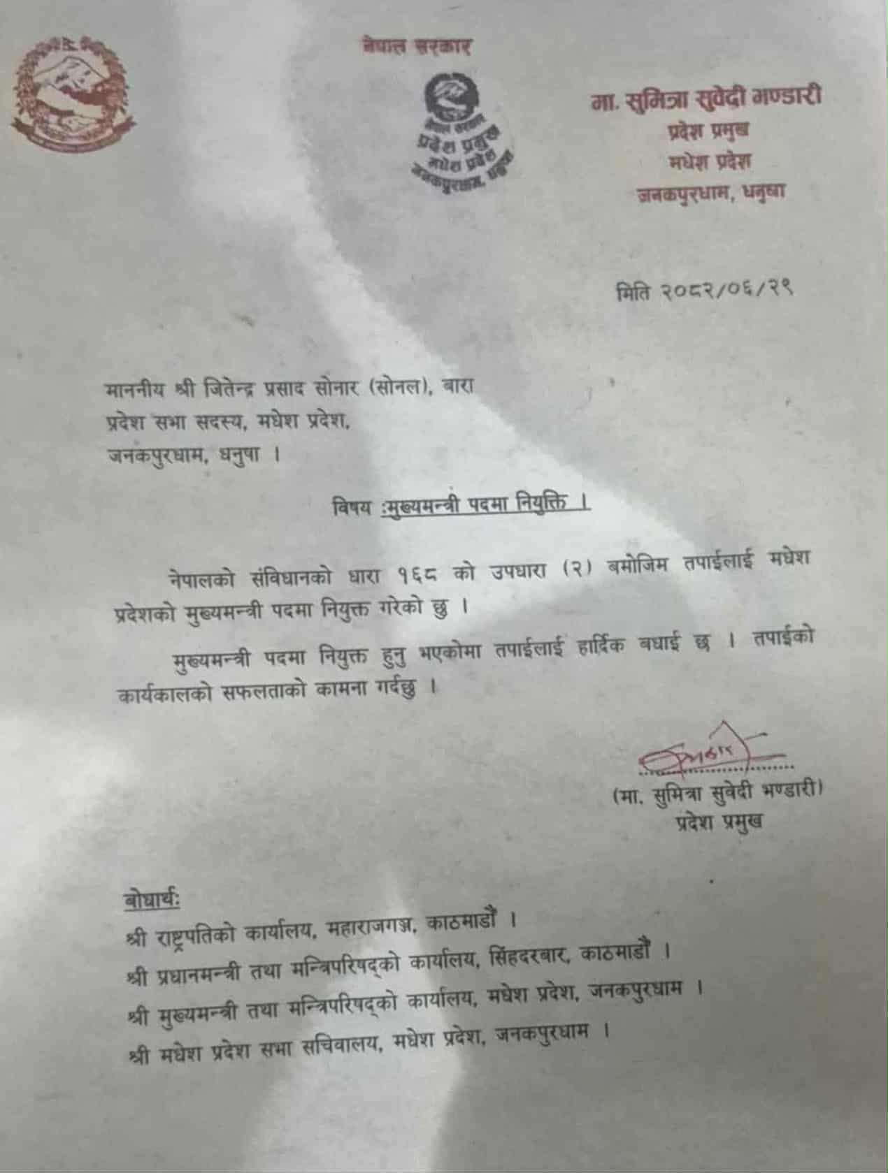 काठमाडौँ । मधेस प्रदेशको मुख्यमन्त्रीमा लोकतान्त्रिक समाजवादी पार्टी( लोसपा ) का जितेन्द्र सोनार नियुक्तभएका छन् । नेपालको संविधानको धारा १६८ को उपधारा २ बमोजिम प्रदेश प्रमुख सुमित्रा सुवेदी भण्डारीले सोनारलाई बुधबार मुख्यमन्त्रीमा नियुक्त गरेकी हुन् ।