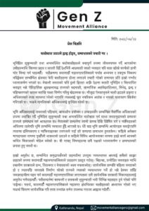 काठमाडौँ महानगरपालिकाका मेयर बालेन्द्र शाह ( बालेन ) ले सहरका अतिक्रमित जमिनमा बनाइएका संरचना हटाउने अभियानलाई प्राथमिकता दिइरहेका बेला जेनजीले उक्त विज्ञप्ति जारी गरेको हो। ‘जेनजी मुभमेन्ट अलायन्स’ले महानगरपालिकालाई सम्बन्धित समुदायसँग सहमति गरेर बस्तीको उपयुक्त व्यवस्थापन गर्न माग गर्दै काठमाडौँलाई सबैको साझा सहर बनाउन आह्वान गरेको छ।