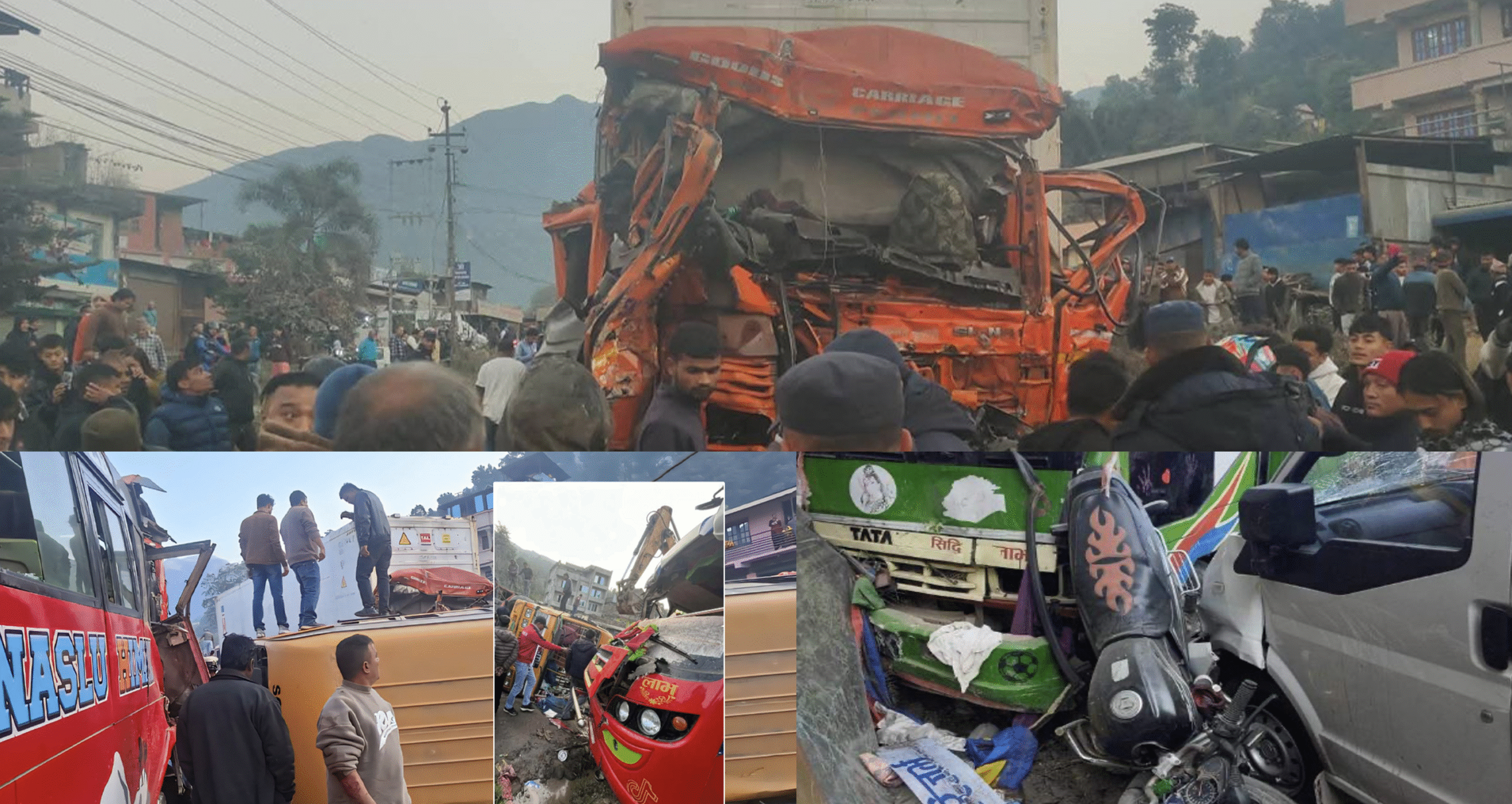 सडकमै थुनिएका जहाँतही चर्का आवाज, फुटेका झ्यालहरू र पल्टिएका सवारीका दृश्यले दुर्घटनाको तीव्रता देखिएको छ। प्रहरीले दुर्घटनाको विस्तृत विवरण र कारण पत्ता लगाउन थप अनुसन्धान थालेको छ।