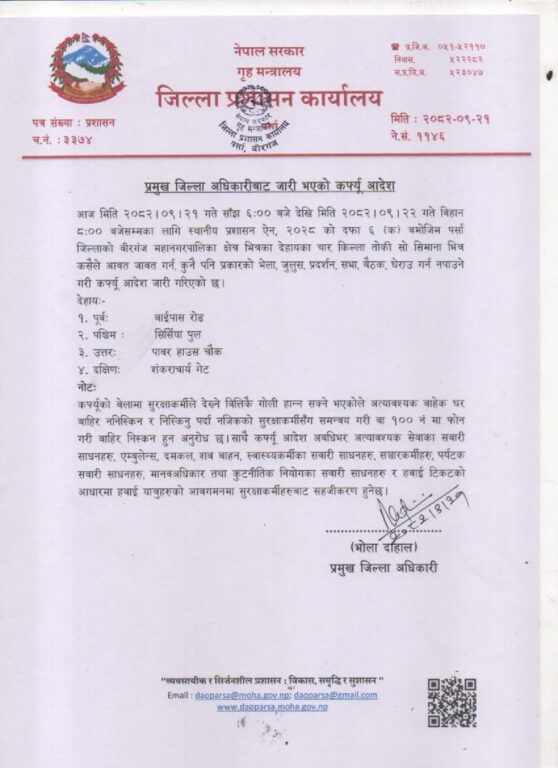 स्थानीय प्रशासन ऐन, २०२८ को दफा ६ ( क ) बमोजिम महानगरपालिकाको पूर्व बाईपास रोड पश्चिम सिर्सिया पुल उत्तरः पावर हाउस चौक दक्षिण शंकराचार्य गेटमा आवतजावत गर्न, कुनै पनि प्रकारको भेला, जुलुस, प्रदर्शन, सभा, बैठक, घेराउ गर्न नपाउने जिल्ला प्रशासन कार्यालयले जारी गरेको सूचनामा उल्लेख गरिएको छ ।