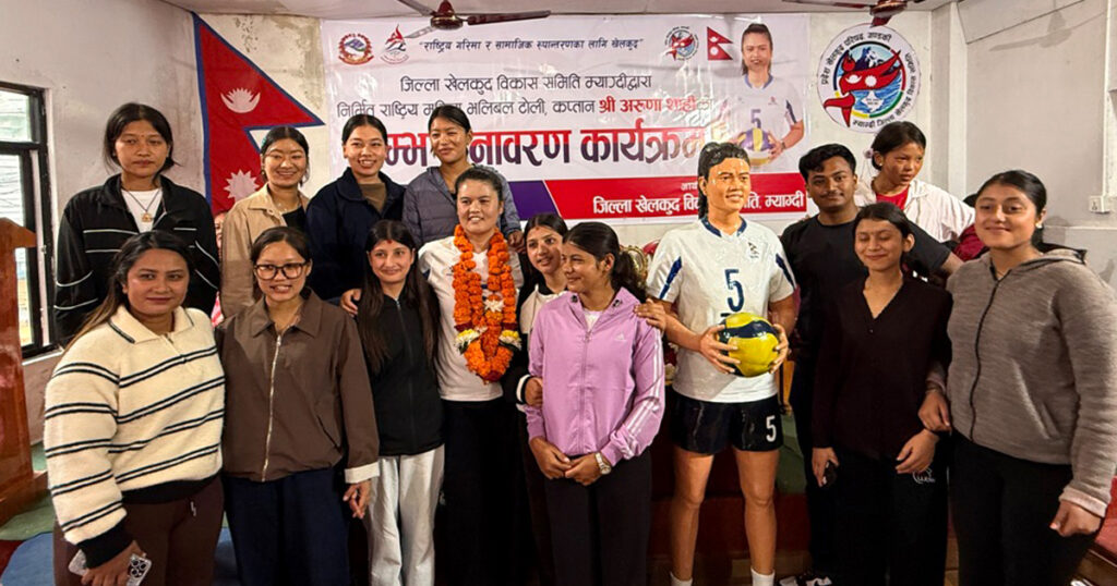 म्याग्दी । राष्ट्रिय महिला भलिबल टोलीकी कप्तान अरुणा शाहीको गृहजिल्ला म्याग्दीको सदरमुकाम बेनीमा आज स्तम्भ अनावरण गरिएको छ। रघुगङ्गा गाउँपालिका–३, पिप्लेमा जन्मिएकी शाहीले खेलकुदको माध्ययमबाट राष्ट्रिय तथा अन्ताराष्ट्रियस्तरमा जिल्लाको गरिमा बढाउन भूमिका निर्वाह गरेकामा जिल्ला खेलकुद विकास समिति म्याग्दीले उनको प्रतिमा निर्माण गरेको हो।