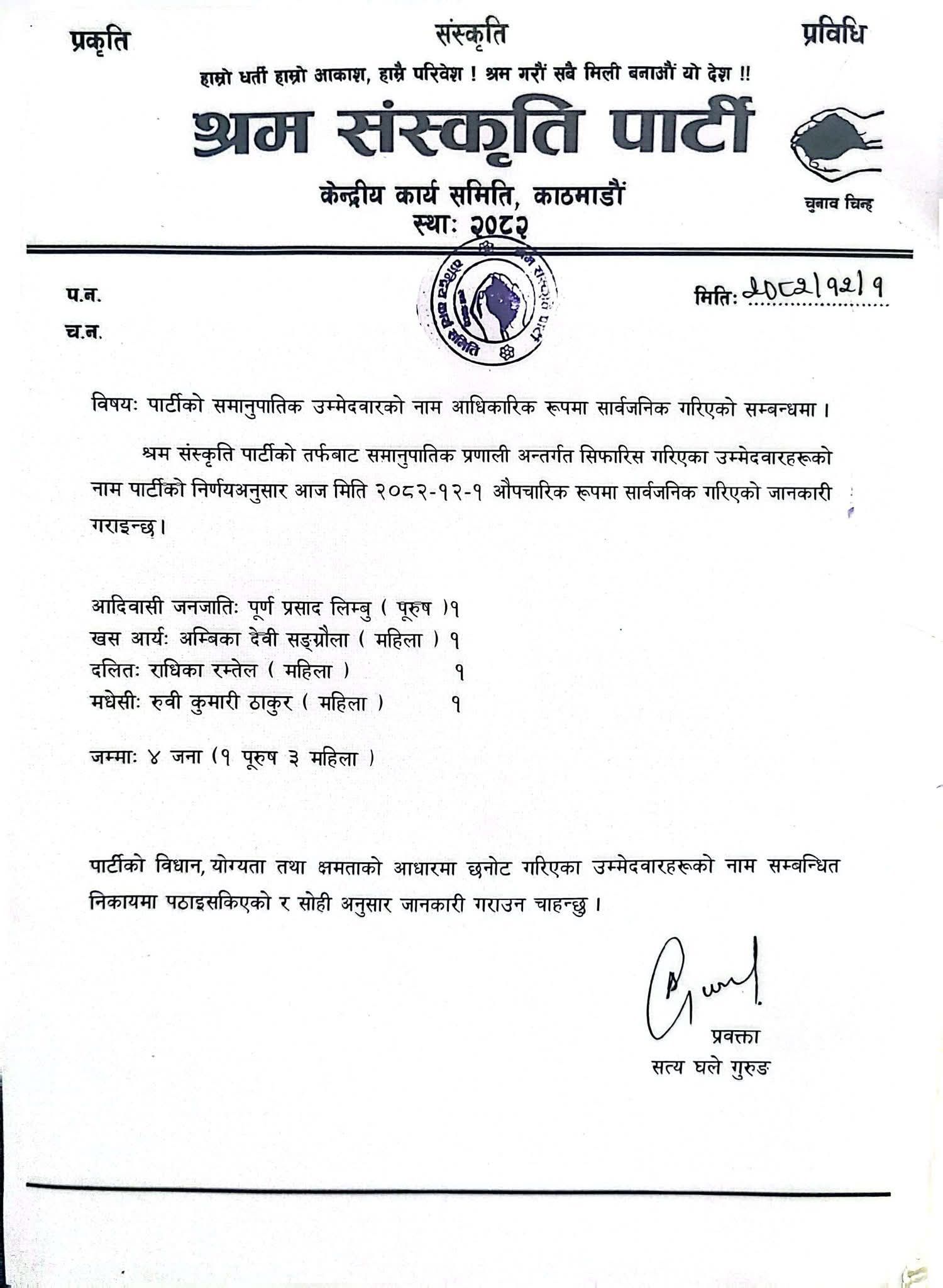 श्रम संस्कृति पार्टीले आदिवासी जनजाति महिलातर्फ पूर्णप्रसाद लिम्बू, खस आर्य महिलाबाट अम्बिकादेवी संग्रौला, दलित महिलाबाट राधिका रम्तेल र मधेशी महिलाबाट रुवीकुमारी ठाकुरको नाम बुझाएको छ ।