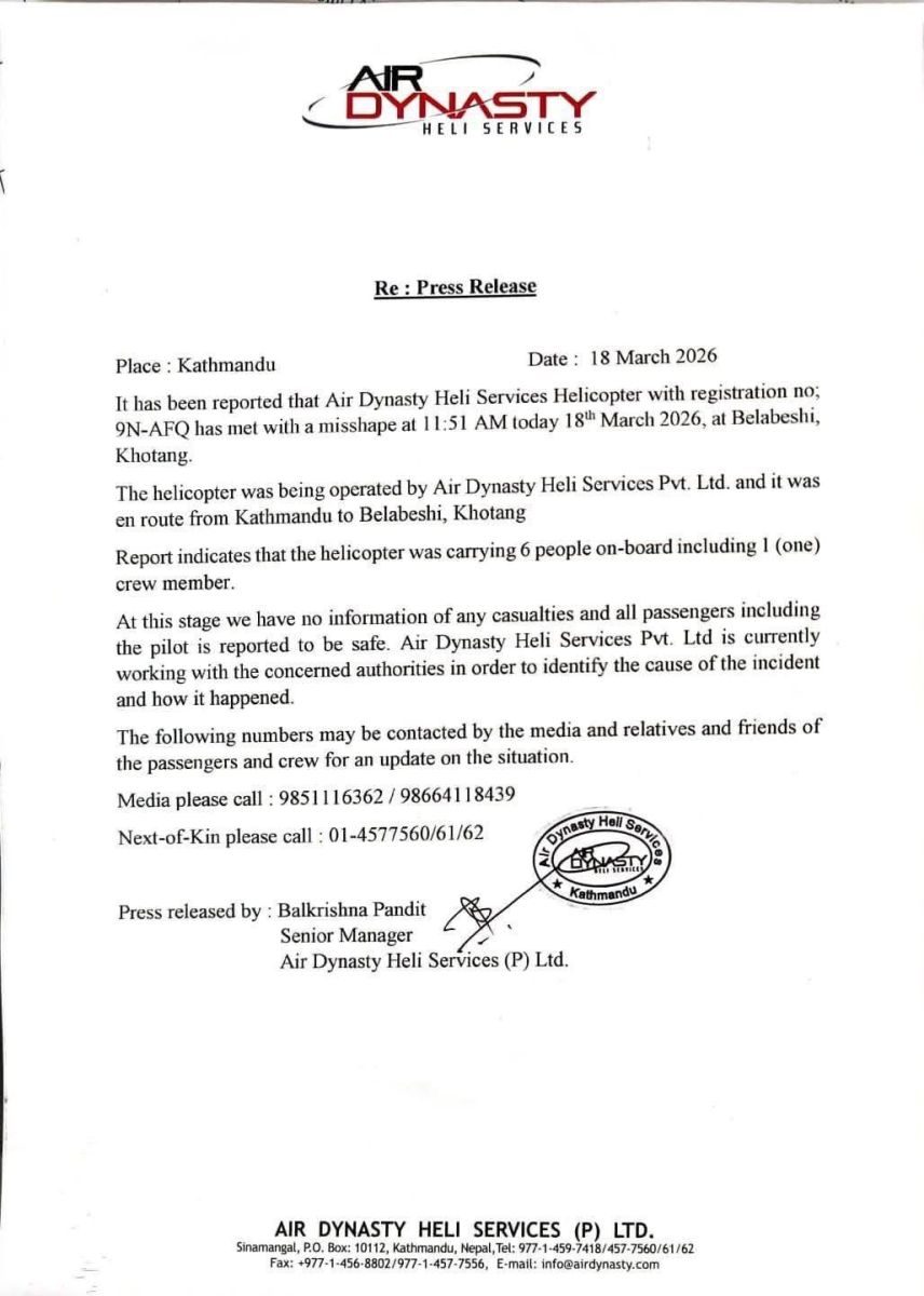 खोटाङ । खोटाङको बेलाबेसीमा बुधबार बिहान भएको हेलिकप्टर दुर्घटनाबारे एयर डाइनेस्टीले दुईवटा छुट्टाछुट्टै विज्ञप्ति जारी गर्दै आधिकारिक जानकारी गराएको छ। काठमाडौंबाट खोटाङतर्फ उडेको ९एन(एएफक्यू कलसाइनको हेलिकप्टर आज बिहान ११. ५१ बजे दुर्घटनामा परेको कम्पनीले जारी गरेको विज्ञप्तिमा उल्लेख छ। कम्पनीका अनुसार हेलिकप्टरमा चालक दलका एक सदस्यसहित कुल ६ जना सवार थिए। दुर्घटनामा परी ७४ वर्षीय कतिबहादुर राई घाइते भएका छन्।