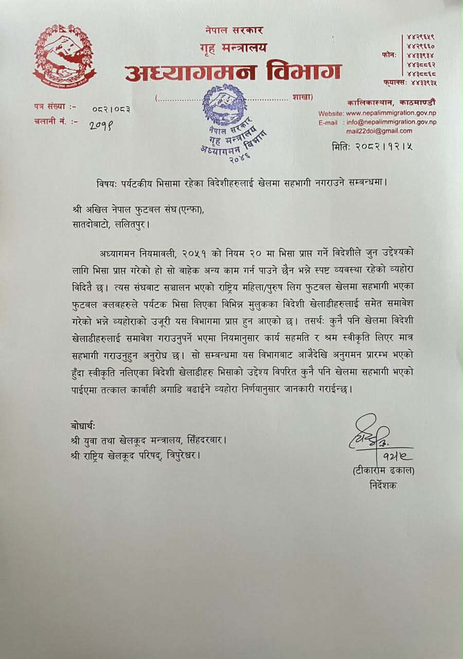 काठमाण्डौं । अध्यागमन विभागले पर्यटक भिसामा आएका विदेशी खेलाडीलाई खेल नखेलाउन अखिल नेपाल फुटबल संघ ९एन्फा०लाई पत्राचार गरेको छ। बिहीबार विभागका निर्देशक टीकाराम ढकालले पठाएको पत्रमा पर्यटक भिसामा आएका विदेशी खेलाडीलाई खेल खेलाएको उजुरी आएको उल्लेख गरेको छ। ‘त्यस संघबाट सञ्चालन भएको राष्ट्रिय महिलारपुरुष लिग फुटबल खेलमा सहभागी भएका फुटबल क्लबहरूले पर्यटक भिसा लिएका विभिन्न मुलुकका विदेशी खेलाडीहरूलाई समेत समावेश गरेको भन्ने व्यहोराको उजुरी यस विभागमा प्राप्त हुन आएको छ,’ पत्रमा भनिएको छ।