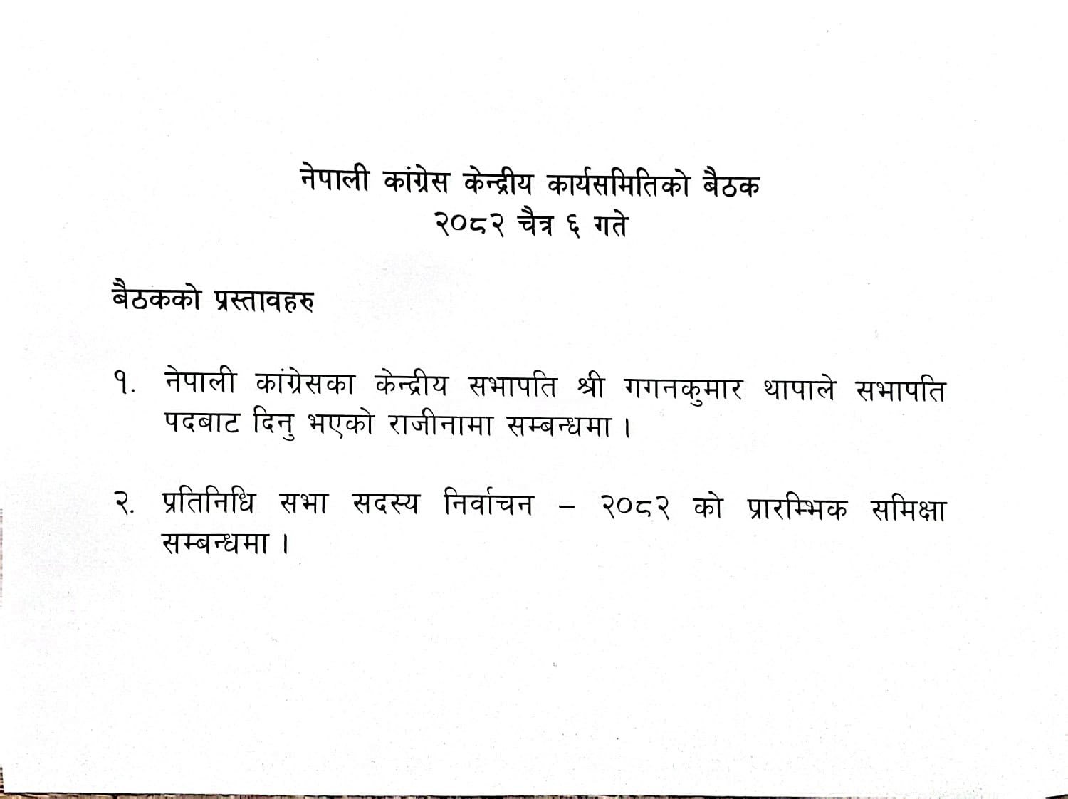 काठमाडौँ । पार्टी केन्द्रीय कार्यालय सानेपामा सुरु भएको नेपाली कांग्रेसको केन्द्रीय कार्यसमिति बैठकमा छलफलका लागि दुई प्रस्ताव पेस भएका छन् ।