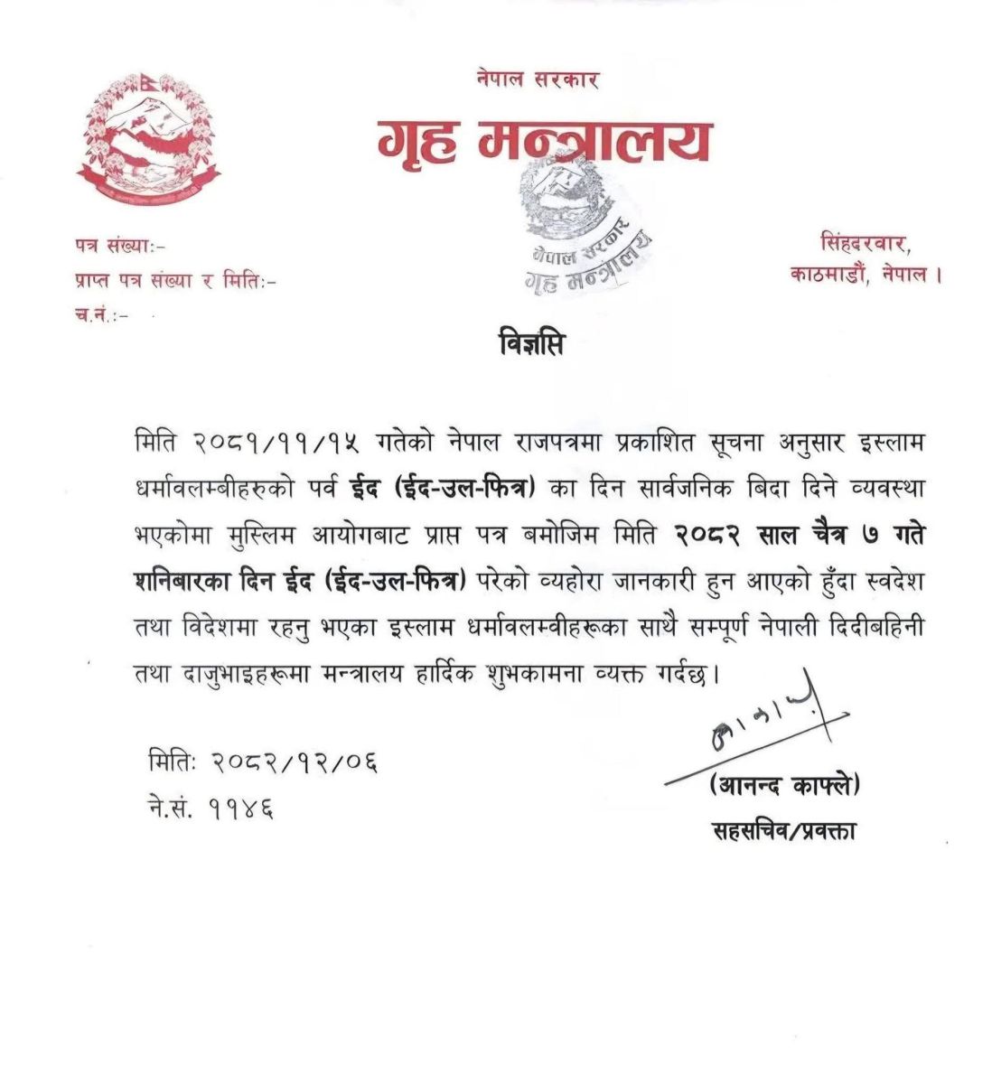 मन्त्रालयका सहसचिव तथा प्रवक्ता आनन्द काफ्लेले जारी गरेको विज्ञप्तिमा स्वदेश तथा विदेशमा रहेका सम्पूर्ण इस्लाम धर्मावलम्बीहरूका साथै सम्पूर्ण नेपाली दिदीबहिनी तथा दाजुभाइमा शुभकामना व्यक्त गरिएको छ।