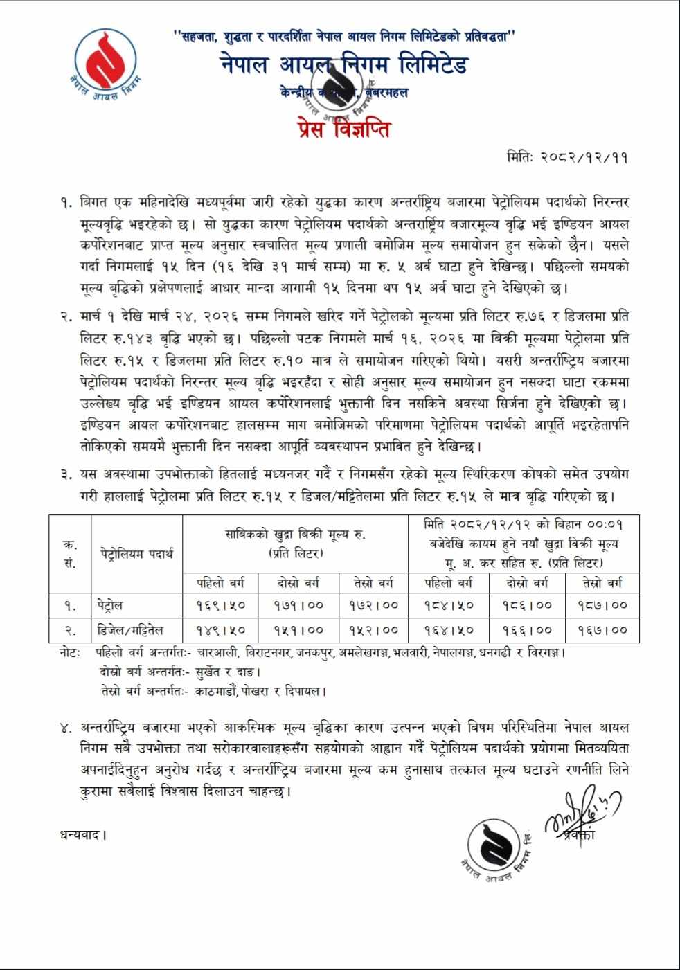 यस्तै डिजेल र मट्टीतेलको मूल्य पहिलो वर्गका लागि १४९ रुपैयाँ ५० पैसाबाट बढेर १६४ रुपैयाँ ५० पैसा पुग्दा दोस्रो वर्गका लागि १६६ रुपैयाँ र तेस्रो वर्गका लागि १६७ रुपैयाँ प्रतिलिटर पुगेको छ । आयल निगमले पहिलो वर्गमा चारआली, विराटनगर, जनकपुर, अमलेखगञ्ज, भलवारी, नेपालगञ्ज, धनगढी र वीरगञ्ज निर्धारण गरेको छ भने दोस्रो वर्गमा सुर्खेत र दाङ तथा तेस्रो वर्गमा काठमाडौं, पोखरा र दिपायल निर्धारण गरेको छ।