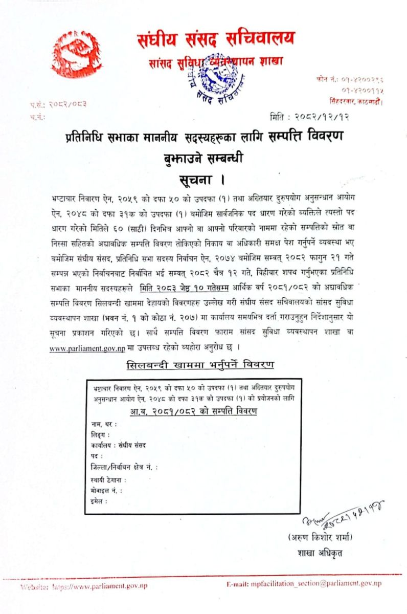 आयोगले केहीदिन अघि नै सूचना निकालेर फागुन २१ गतेको निर्वाचनबाट निर्वाचित भइ यही चैत १२ गते शपथ ग्रहण गरेका सबै सांसद्लाई आफ्नो सम्पत्ति विवरण बुझाउन अनुरोध गरेको हो ।