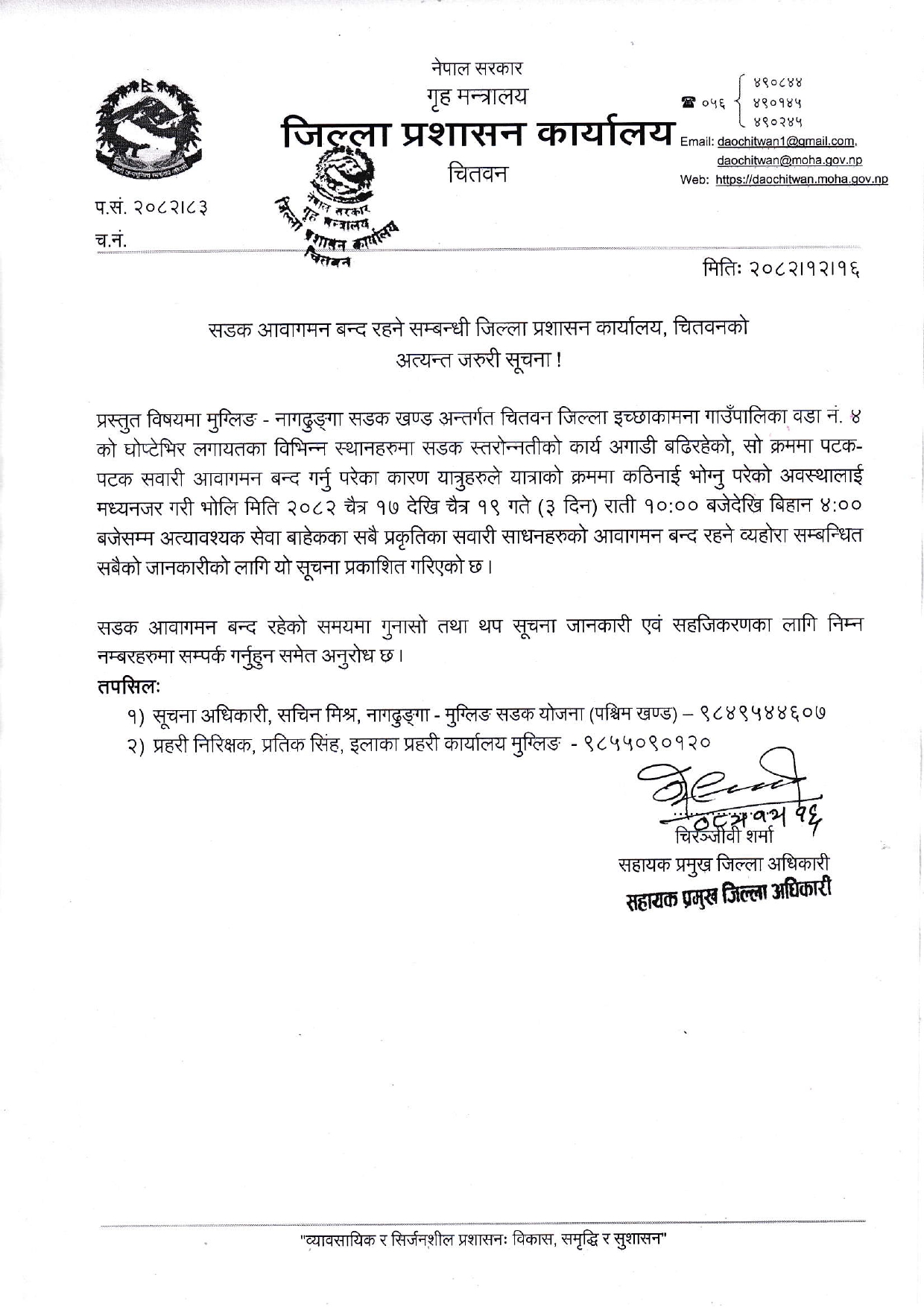 चितवनका सहायक प्रमुख जिल्ला अधिकारी चिरञ्जीवी शर्माले निकालेका सूचनामा यात्रुहरूलाई पर्न सक्ने असुविधाप्रति ध्यान दिँदै समय हेरेर आफ्नो यात्रा तय गर्न अनुरोध गरेको छ।