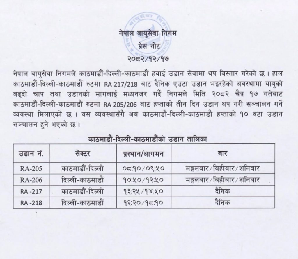 यस व्यवस्थासँगै अब काठमाडौं–दिल्ली–काठमाडौं हप्ताको १० वटा उडान सञ्चालन हुने निगमले जनाएको छ।