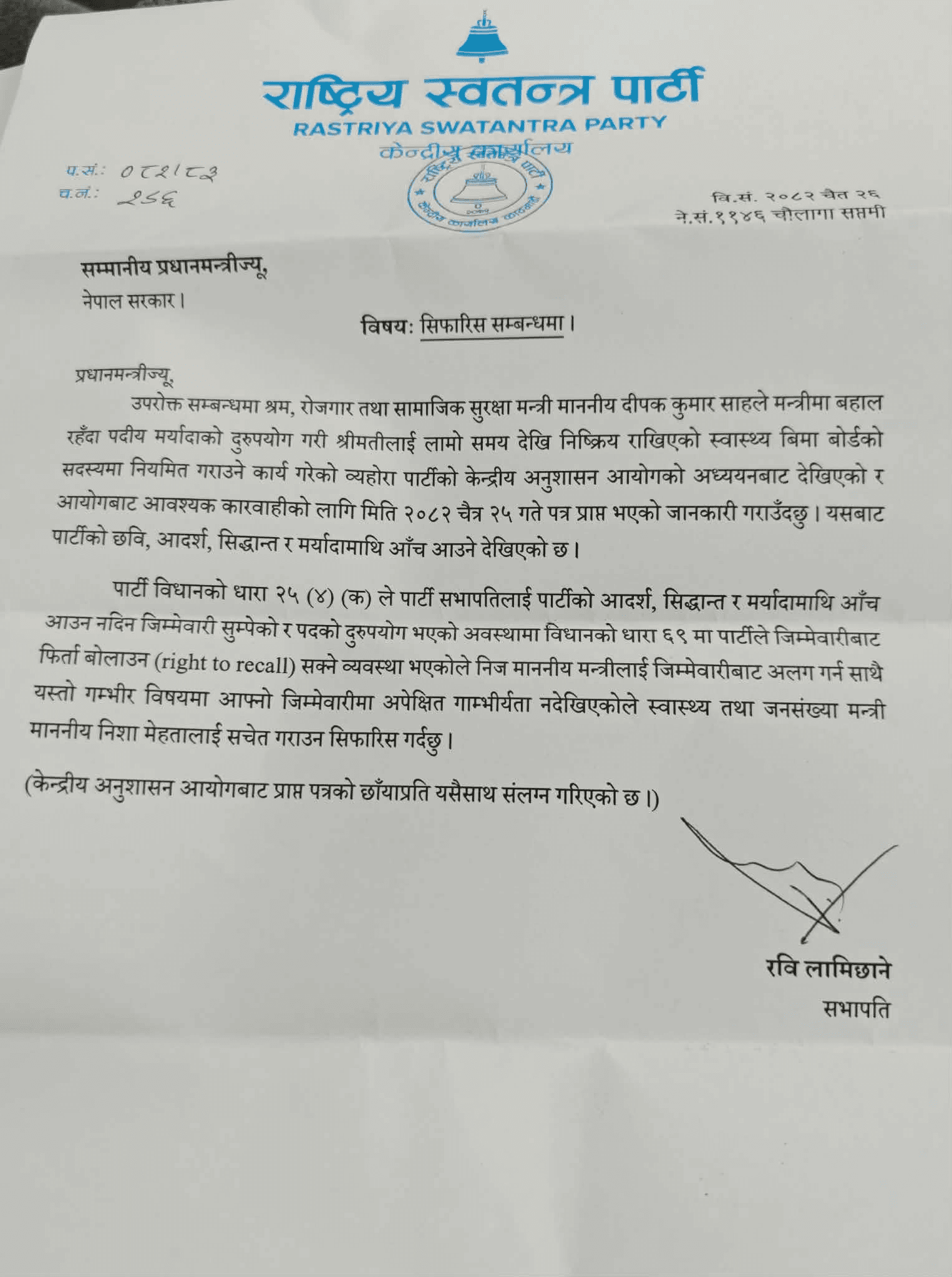 यसअघि, रास्वपा सभापति रवि लामिछानेले साहलाई पदमुक्त गर्नका लागि प्रधानमन्त्रीलाई पत्र पठाएका थिए । पत्रमा भनिएको थियो, ‘श्रम, रोजगार तथा सामाजिक सुरक्षा मन्त्री माननीय दीपक कुमार साहले मन्त्रीमा बहाल रहँदा पदीय मर्यादाको दुरुपयोग गरी श्रीमतीलाई लामो समय देखि निष्क्रिय राखिएको स्वास्थ्य बिमा बोर्डको सदस्यमा नियमित गराउने कार्य गरेको व्यहोरा पार्टीको केन्द्रीय अनुशासन आयोगको अध्ययनबाट देखिएको र आयोगबाट आवश्यक कारवाहीको लागि मिति २०८२ चैत्र २५ गते पत्र प्राप्त भएको जानकारी गराउँदछु । यसबाट पार्टीको छवि, आदर्श, सिद्धान्त र मर्यादामाथि आँच आउने देखिएको छ ।’