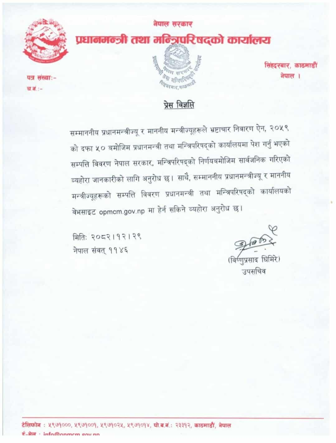 आइतबार प्रधानमन्त्री तथा मन्त्रिपरिषद् कार्यालयले प्रधानमन्त्री बालेन शाहसहित मन्त्रीहरूको सम्पत्ति विवरण सार्वजनिक गरेको हो।