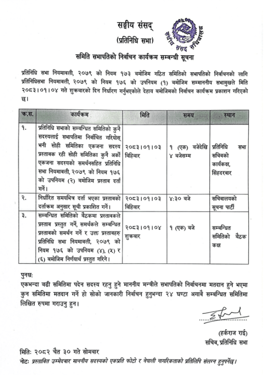 गत चैत २७ गते प्रतिनिधिसभाले विषयगत समितिमा रहने सदस्यहरू तय गरेको थियो । सोही दिन सभामुख डोलप्रसाद अर्यालले आगामी शुक्रबार संसदीय समितिका सभापतिको निर्वाचनको मिति तोकेका थिए ।