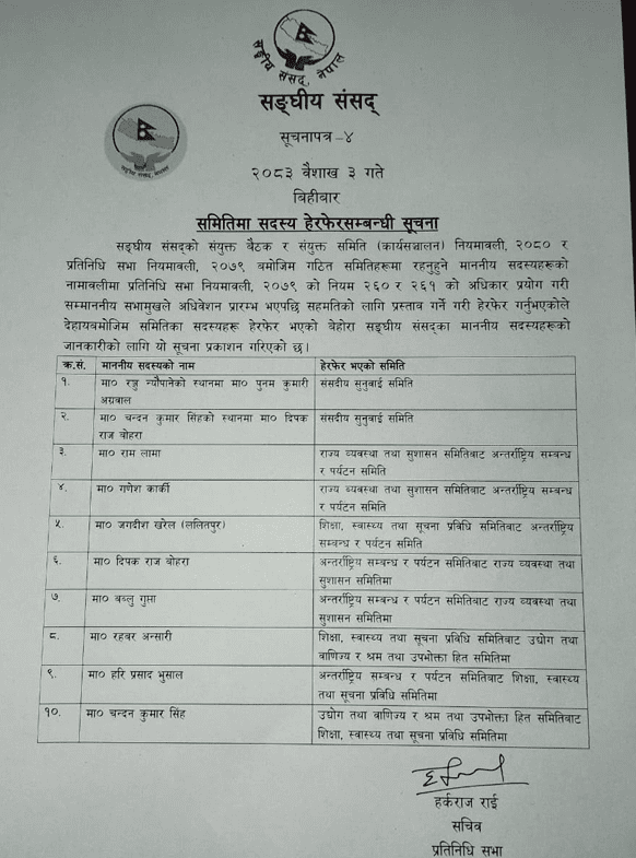 राम लामालाई राज्य व्यवस्था तथा सुशासन समितिबाट अन्तर्राष्ट्रिय सम्बन्ध र पर्यटन समितिमा पुर्याइएको छ । गणेश कार्कीलाई राज्य व्यवस्था तथा सुशासन समितिबाट अन्तर्राष्ट्रिय सम्बन्ध र पर्यटन समितिमा, जगदीश खरेल ९ललितपुर० शिक्षा, स्वास्थ्य तथा सूचना प्रविधि समितिबाट अन्तर्राष्ट्रिय सम्बन्ध र पर्यटन समितिमा ल्याइएको छ । दीपकराज बोहरालाई अन्तर्राष्ट्रिय सम्बन्ध र पर्यटन समितिबाट राज्य व्यवस्था तथा सुशासन समितिमा, बब्लु गुप्ता अन्तर्राष्ट्रिय सम्बन्ध र पर्यटन समितिबाट राज्य व्यवस्था तथा सुशासन समितिमा ल्याइएको छ ।