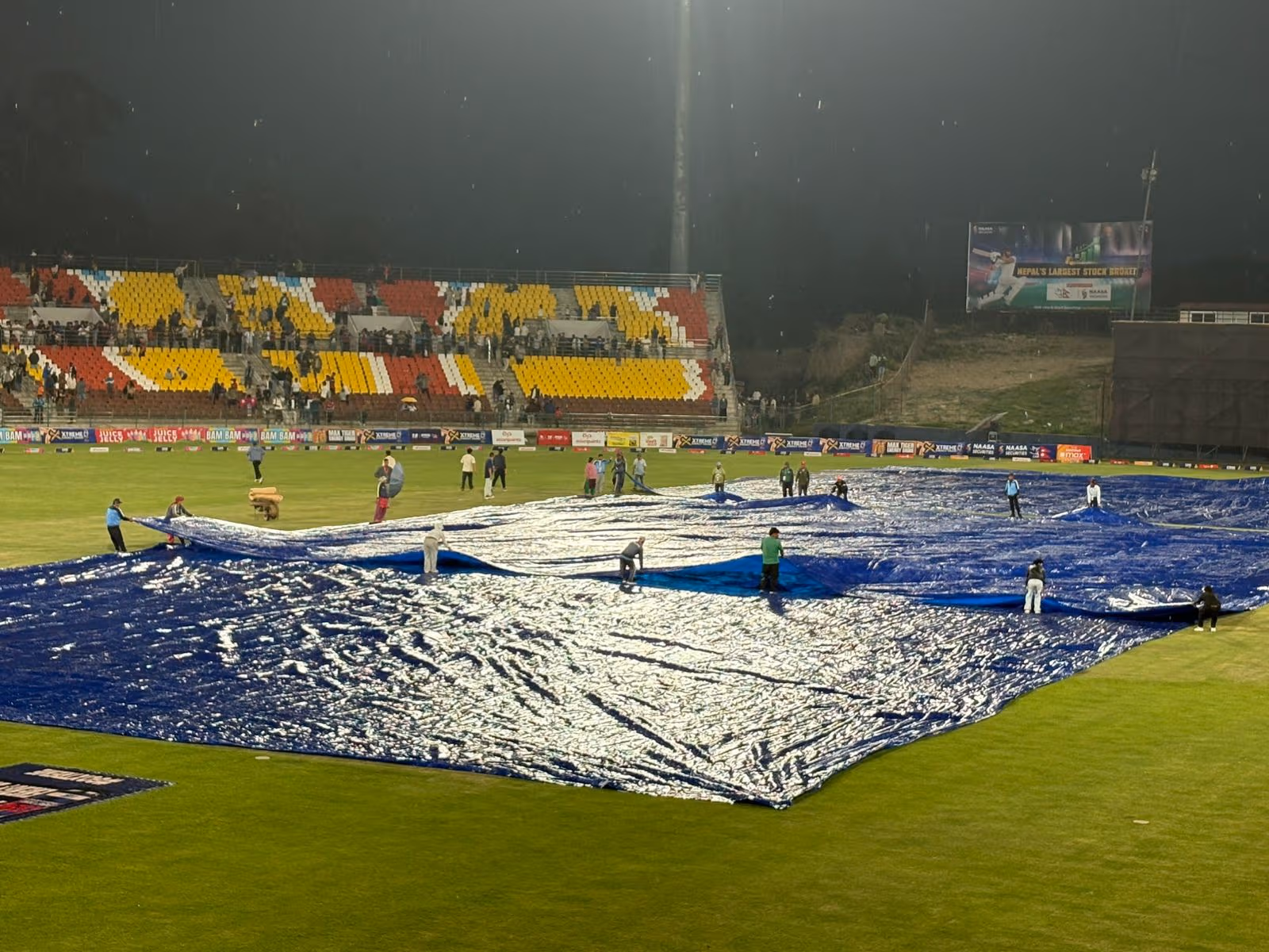 बलिङतर्फ नेपालका सन्दीप लामिछानेले २ ओभरमा ८ रन खर्चेर तीन विकेट लिए । यस्तै कुशल मल्लले एक विकेट हात पारे । त्यसअघि कीर्तिपुरस्थित टियु मैदानमा टस जितेर पहिले ब्याटिङ थालेको नेपालले १८।५ ओभरमा ८ विकेट गुमाएर १२२ रन जोडेको अवस्थामा खेल रोकिन पुगेको थियो ।
