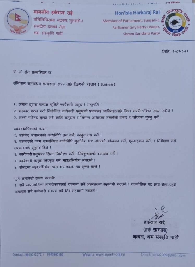 काठमाडौं । श्रम संस्कृति पार्टीका अध्यक्ष एवं संसदीय दलका नेता हर्क साम्पाङले जनताद्वारा प्रत्यक्ष निर्वाचित कार्यकारी राष्ट्रपतीय शासनप्रणालीको प्रस्ताव गरेका छन् । संविधान संशोधन बहसपत्र तयार गर्ने कार्यदलसमक्ष उनले विभिन्न प्रस्ताव राखेका हुन् ।